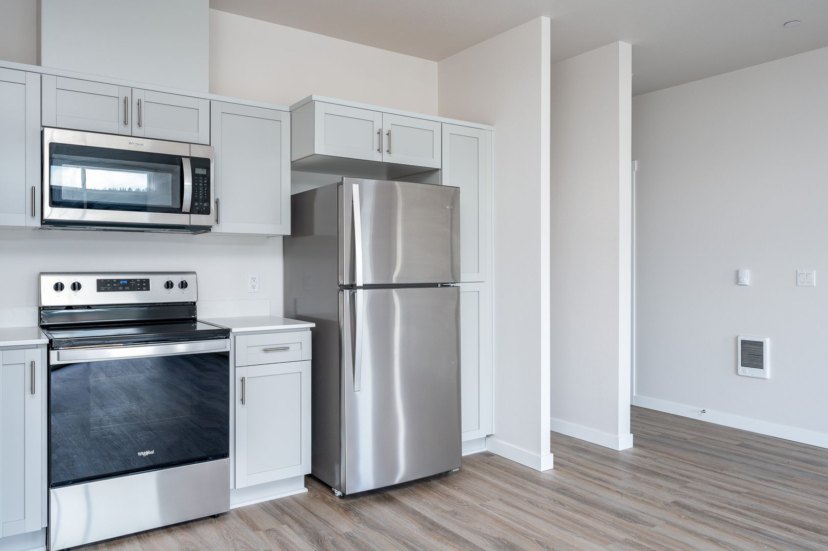 Each apartment features sleek stainless-steel appliances, including a microwave and dishwasher, paired with designer gray or rich walnut cabinetry and luxurious quartz countertops for a clean, modern aesthetic. Generous layouts provide plenty of room to live, work, and entertain.