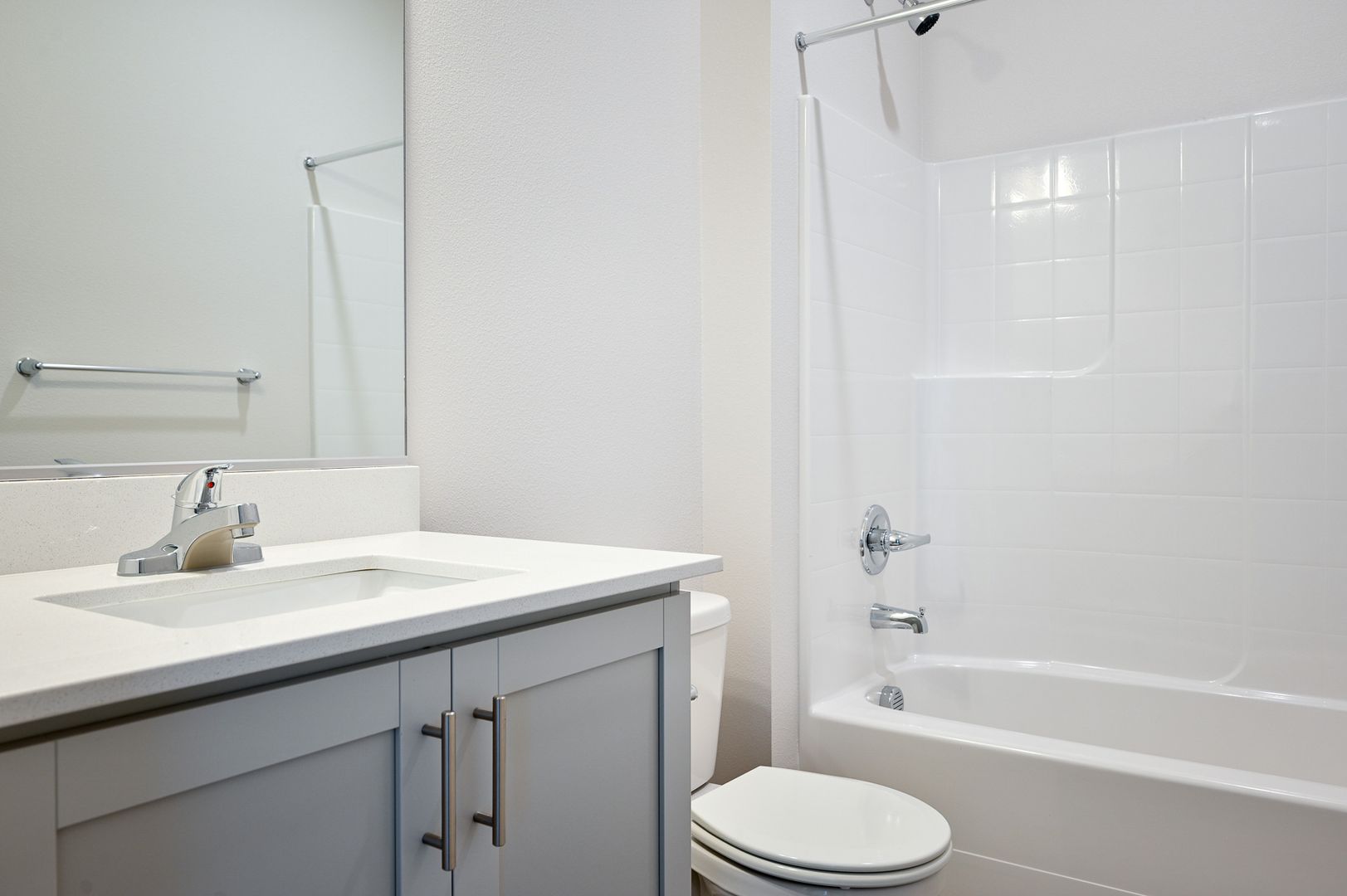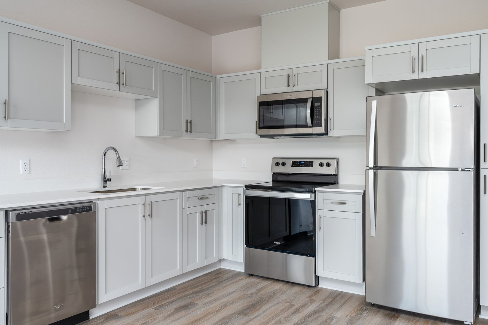 Each apartment features sleek stainless-steel appliances, including a microwave and dishwasher, paired with designer gray or rich walnut cabinetry and luxurious quartz countertops for a clean, modern aesthetic. Generous layouts provide plenty of room to live, work, and entertain.